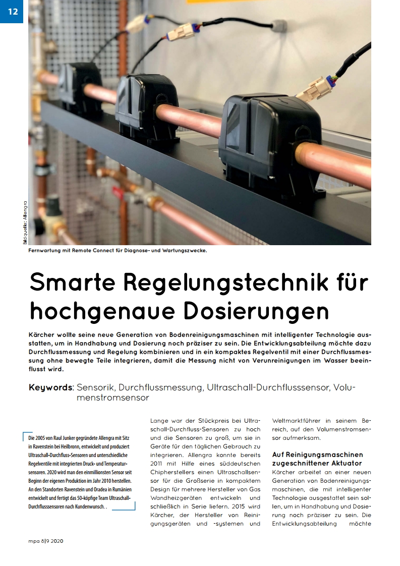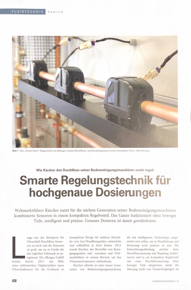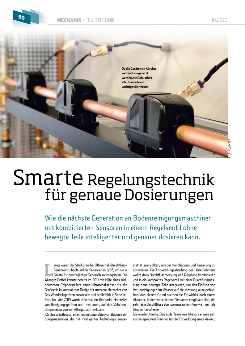 Da die Geräte von Kärcher in der gesamten Welt eingesetzt werden, ist Robustheit aller Bauteile eines der wichtigsten Kriterien. Sukzessive wurden weitere Mitarbeiter in das Projekt miteinbezogen und die Latte immer höher gelegt. Durch intensive Tests konnten Allengra und Kärcher zusammen das Regelventil immer weiter verfeinern. Mittlerweile befindet sich das Ultraschall-Regelventil im Feldversuch. Dieses Jahr noch erfolgt die Markteinführung. Für Kärcher wie für Allengra ist das Projekt ein Gewinn. Als agile Ideenschmiede mit einem dynamischen Team war Allengra ein wichtiger Partner für eine schnelle und kostengünstige Entwicklung eines hochspezialisierten Produkts, das sich alleine durch seine Größe dank moderner, platzsparender Sensorik leicht integrieren ließ. Das Projektteam von Kärcher war für Allengra ein professioneller Sparringspartner mit viel Entwicklungserfahrung und einer gewachsenen globalen Infrastruktur. Beides eröffnete für das Projekt Möglichkeiten, den neuen Regler bereits in die nächste Generation von Scheuersaugmaschinen zu integrieren.
