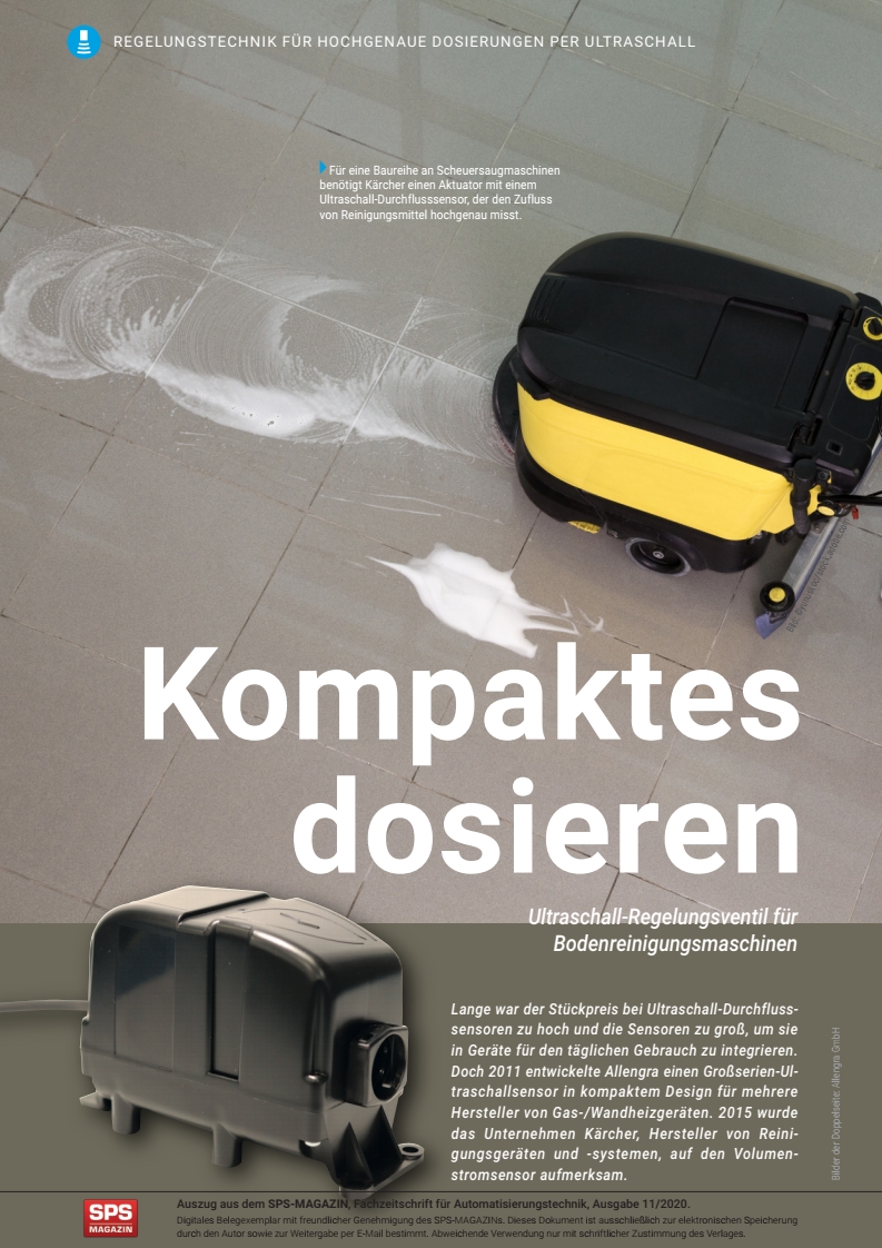 Für eine bestimmte Linie seiner Scheuersaugmaschinen benötigt Kärcher einen Aktuator mit Ultraschall-Durchflusssensor, der den Zufluss von Reinigungsmittel hochgenau misst, so dass dieser einfach zu kontrollieren und einzustellen ist. Ein zusätzlicher Drucksensor indiziert das Niveau im Frischwassertank, das sich zwischen 0 und 90 cm bewegt. “Die Messung sollte auf einer Skala von 0 bis 90 Millibar erfolgen. Eine anspruchsvolle Aufgabe, die wir mit unserem Drucksensor jedoch mit Bravour lösen konnten”, so Raul Junker, Gründer und Inhaber von Allengra. Als drittes wollte Kärcher bei der Zudosierung der Reinigungsflotte eine saubere und noch genauere Lösung als in den bisherigen Bodenreinigungsmaschinen. Dazu muss das Ventil für die Ausbringung der Reinigungsflotte nicht nur hundertprozentig dicht sein, sondern auch schnell schließen. Das Regelventil von Allengra bringt es dabei auf 1,4 Sekunden Verschlusszeit.